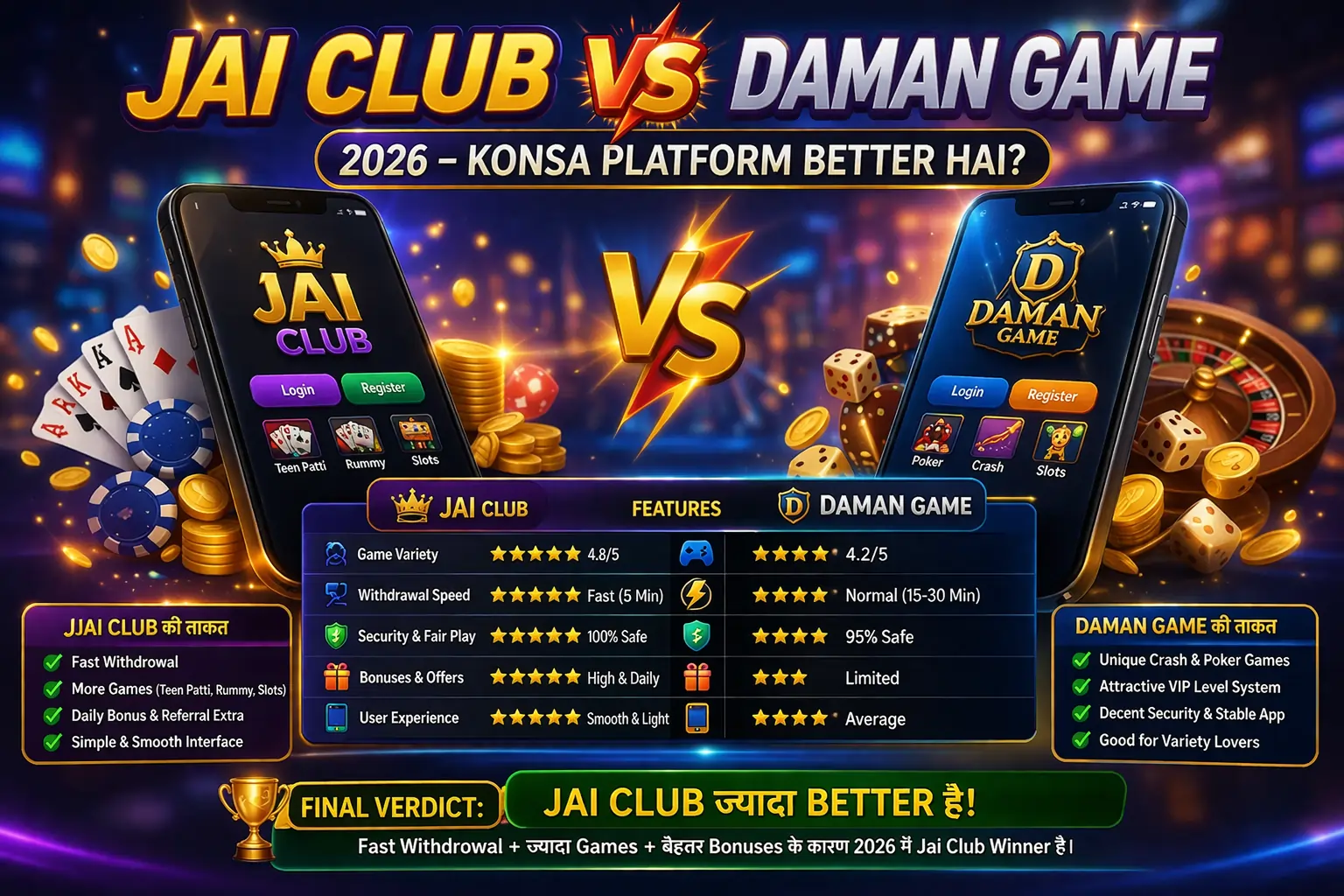 Is complete 2026 guide mein hum Jai Club vs Daman Game ka pura comparison karenge — games, bonus, withdrawal speed, agent program, safety aur bahut kuch. Is article ke end mein aapko pata chal jayega ki konsa platform aapke liye better hai.